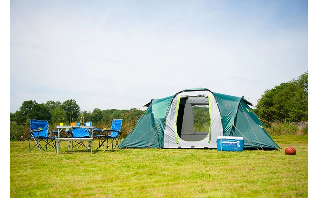 Das Zelt verfügt über ein starkes, aber leichtes Fiberglasgestänge und eine leistungsstarke Außenhülle mit 4.500mm Wassersäule. Diverse Belüftungsöffnungen und doppellagige Mesh-Türen ermöglichen eine gute Luftzirkulation im Zelt und der voll integrierte PE-