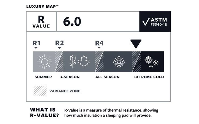 Die LuxuryMap steht für höchsten Komfort an den richtigen Stellen. Drucksensorentechnologie garantiert durchdachte Stützkraft. Eine Höhe von 7,6 cm sorgt für eine sehr bequeme Schlaffläche, während der hochwertige Schaumstoff mit einem R-Wert von 6,0 vor Kälte schützt. Das weiche Stretch-Strickmaterial fühlt sich angenehm an.